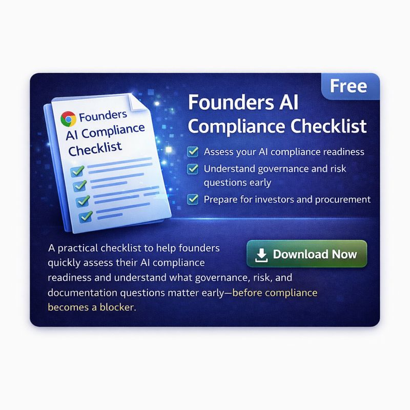 The Founders AI Compliance Checklist is a practical starting point for founders who want to understand what AI compliance actually requires – without reading regulations or hiring consultants upfront.